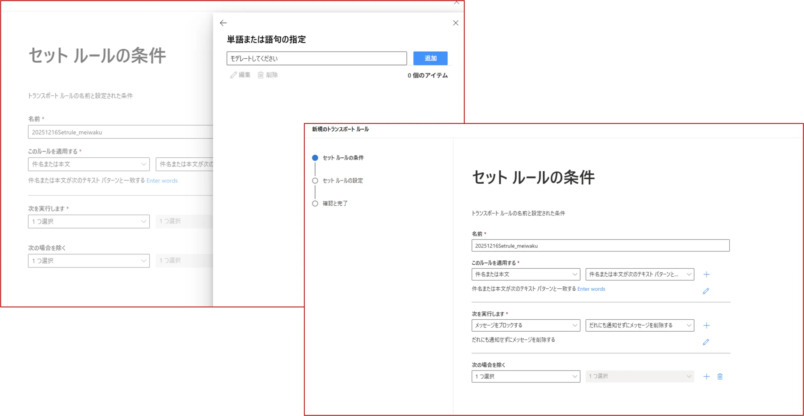 4.名前(任意)→このルール・・・”件名または本文#→”件名または本文が次のテキストパターンと一致する”→”メッセージをブロックする”→”だれにも通知せず、メッセージを削除する”→次へ→完了押下