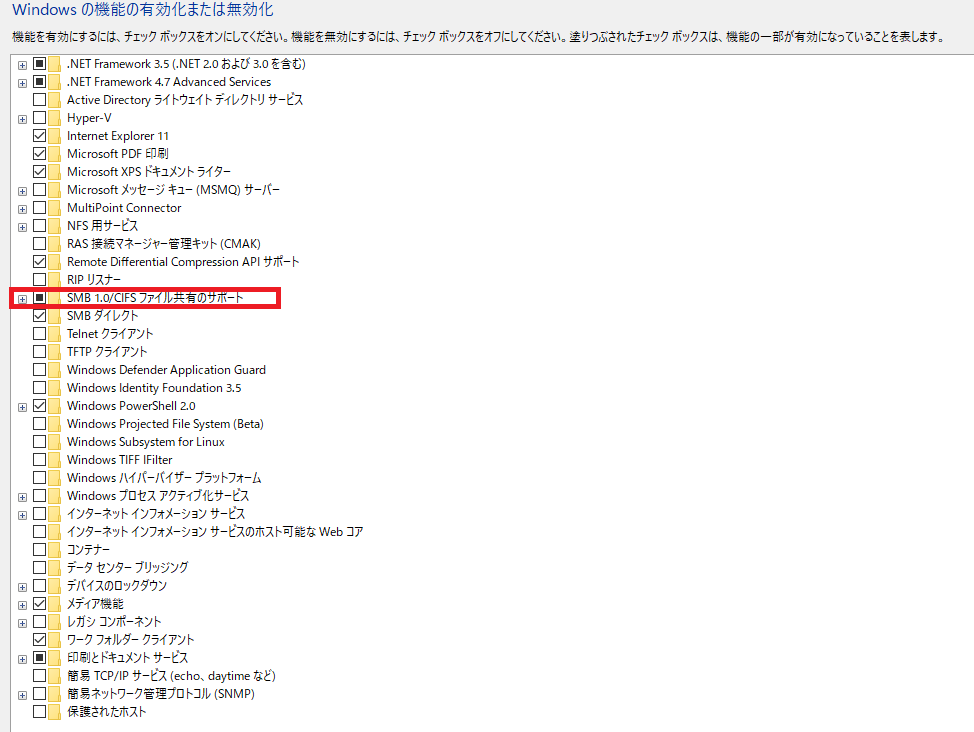 メモ SMB 1.0は、古いNASなどとのファイル共有に使われている ランサムウェア「Wannacry」の感染拡大を防ぐため、無効化が勧められています。SMB 1.0を利用する、古いNASでは止めると、共有が見れなくなります。